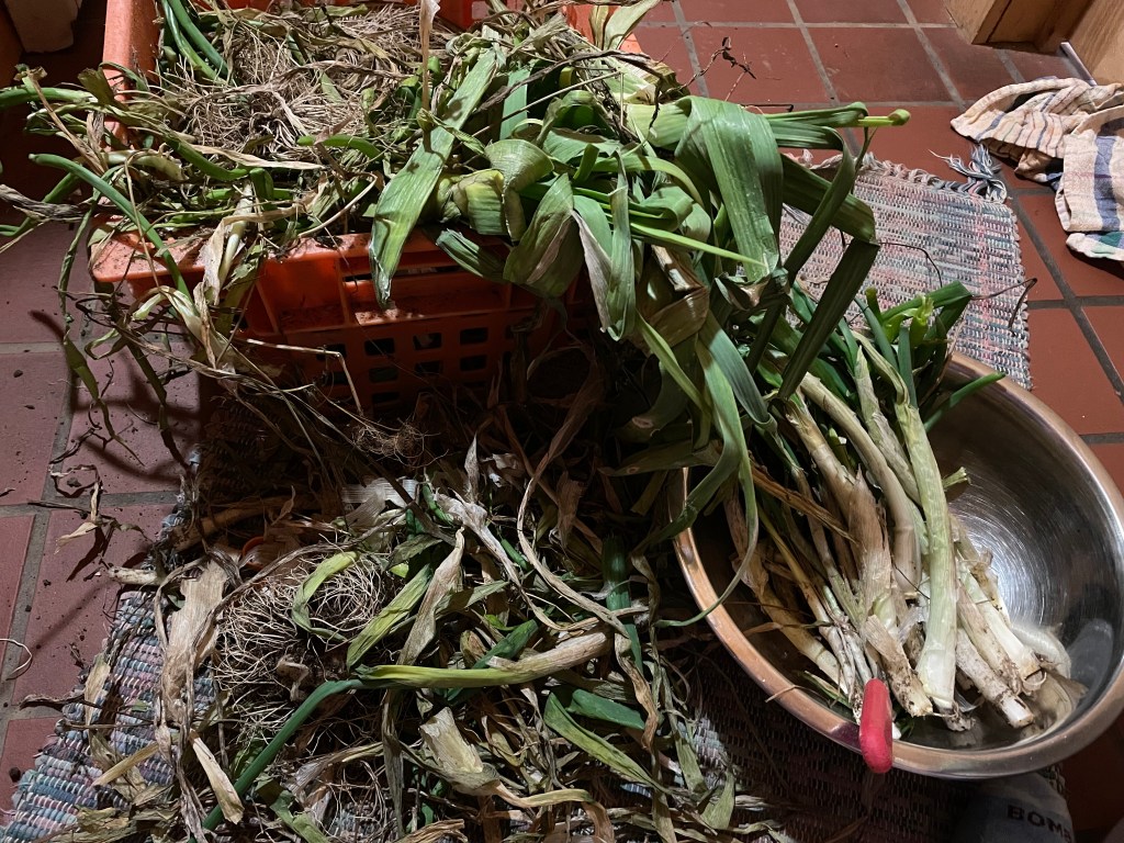 This is me cutting the dirty and dead parts off a crate full of leeks and scallions. I live in Maine, and one night last week, before the ground had frozen and just before we were expecting a significant snowfall, my husband went out into the garden after dark and dug up a crate full of leeks and scallions. They sat in the breezeway for a few days, we covered them with old coats on the nights when the temperatures were going to get into the teens. Finally, this morning, I got around to cleaning them up and putting them in the crisper drawer of the refrigerator.