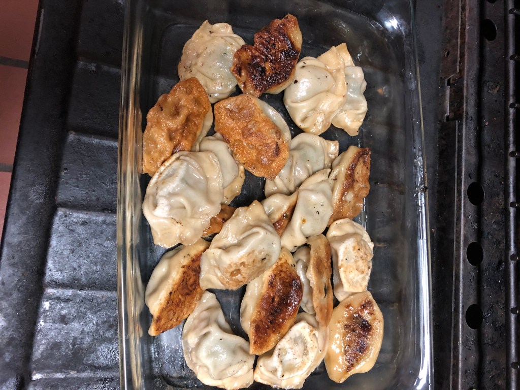 Add a few tablespoons oil to the frypan, add as many dumplings as will fit comfortably, and fry until brown on one side. Pour in a cup of water and cover, steaming them until done and all water is absorbed. This may take 5 minutes for fresh or more time if they have been frozen.