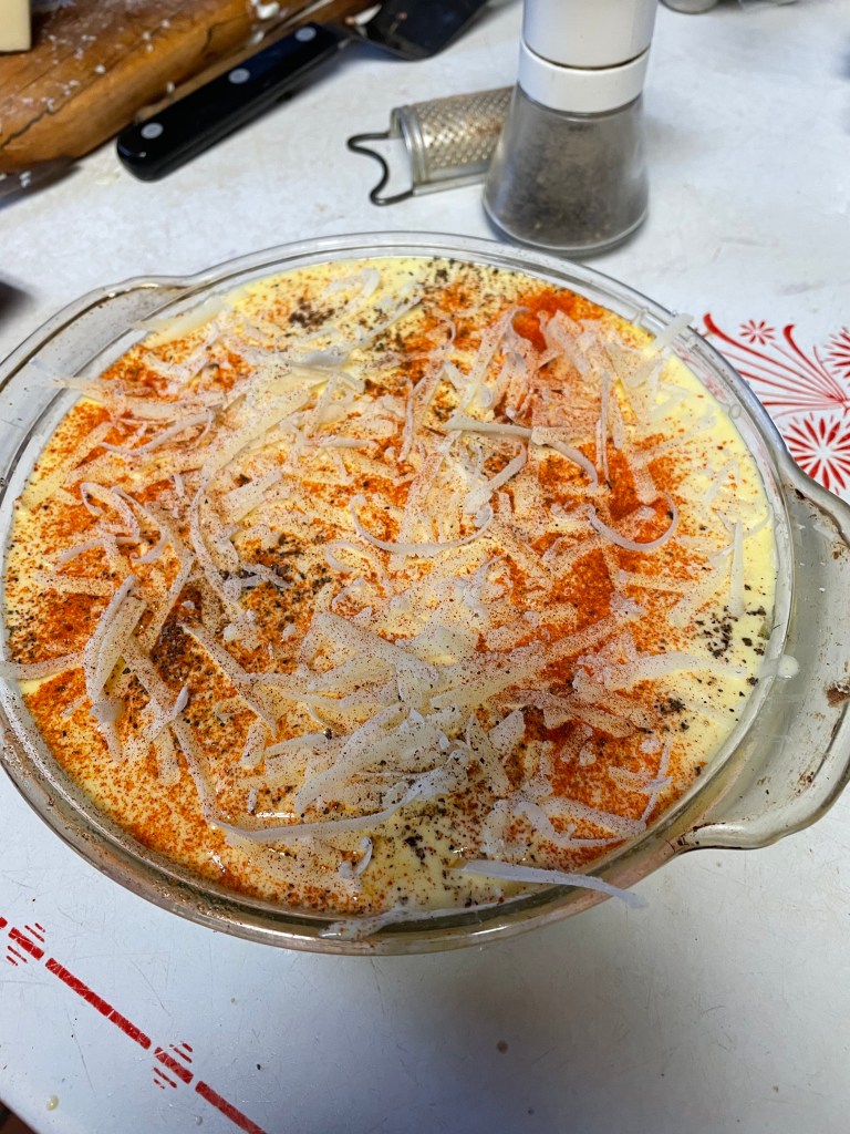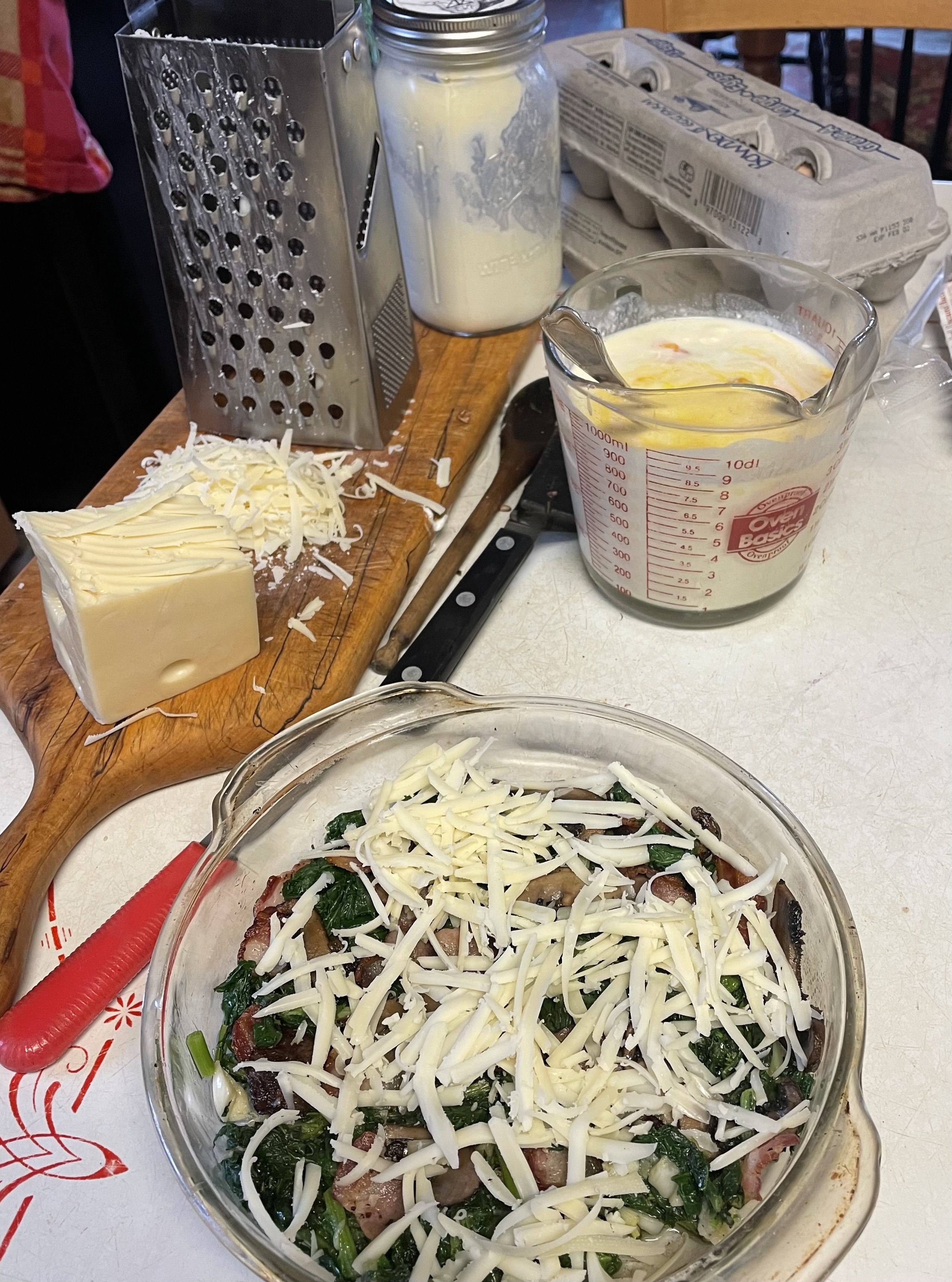 Thankfully, our chickens- the ones who survived the very cold winter, the ravages of fox and eagle, and other enemies, anyway– have started laying eggs again and it is time to make crustless quiche. I love this recipe for its simplicity and delicious taste as well as for the ways it can be adapted to the ingredients I have on hand. You can use any vegetables on hand as well as any combination of milk, heavy cream, half, and or yogurt. Mine was made of cream and yogurt this time. And lots of big fat eggs, as if the chickens had been storing up for months to make these.