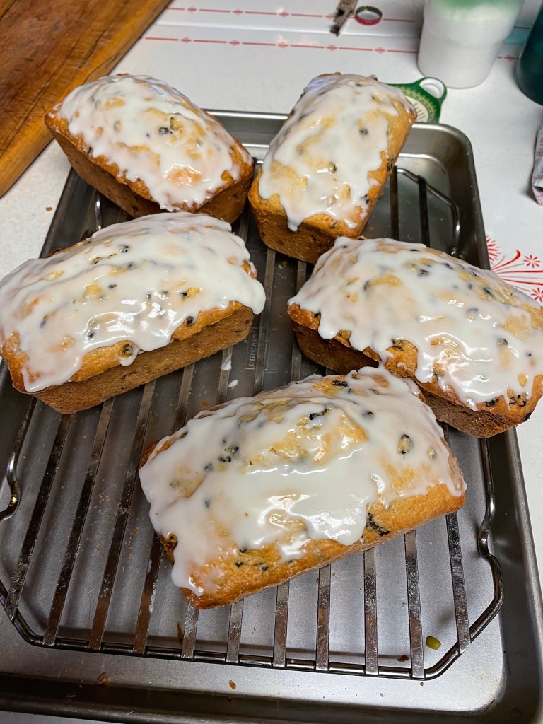 I have had this recipe for delicious tea cakes or quick breads since early in my marriage. I don’t remember where I got it, though I was into reading Gourmet magazines at the time and I suspect this recipe came thence. They are filled with currants, butter and have just a light glaze on top. I often make them to serve with the corned beef and cabbage feast around the 17th of March. I hope you enjoy them.