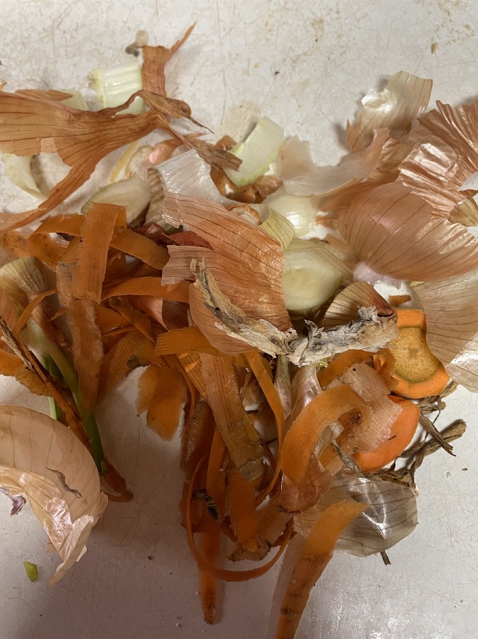 I collect carrot peels, celery scraps, mushroom stems, parsley stems, and bits of trimmings from tomatoes or anything that would go into a vegetable broth. Not cabbage family scraps, as they would be too overpowering. I am creative and find all sorts of useful things when I clean my refrigerator. I collect these scraps and, once they are frozen, press them down with my hand to compact them and repeat until I fill my container. Then it’s time to make broth. First, check the refrigerator, the onion bin, and the garden for fresh things that need using up. Half an onion, some wilted celery, or mushrooms. I saute them in the big soup pot in a little olive oil until they wilt a bit. Then add the whole container of frozen scraps, some peppercorns, a bay leaf, and some dried thyme or rosemary. Sometimes I add dried mushrooms, whole garlic cloves, and a little salt. Fill the pan with water to cover the vegetables. Bring this to a boil, cover, turn the heat down and simmer for 30 mins. At this point, I might add a half cup of white wine and cook another fifteen minutes. Then cool and strain. With all the different ingredients, this broth has a rich complex flavor that is hard to describe. But it is delicious. Most importantly, only add enough water to cover the vegetables available, or the broth will not be flavorful enough.