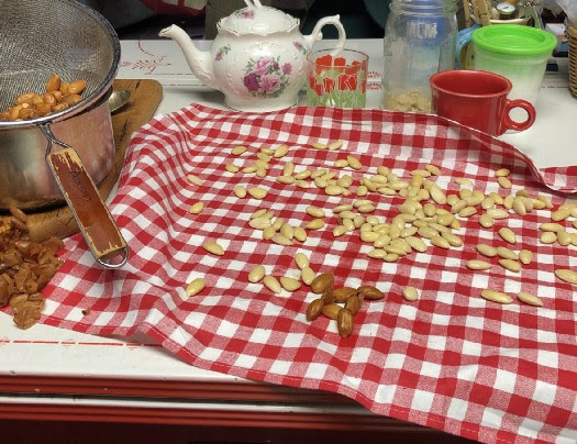 I was spending an enjoyable few minutes in my kitchen this morning, blanching almonds and peeling them. It was a pleasure to sit on my kitchen stool with a pan full of blanched nuts, and remove the skin from each one, letting it sit on the red-checked kitchen towel to dry before adding them to my nut mix. I got to thinking about why this activity, and other similar activities, like shelling peas, or chopping vegetables for a stir-fry seemed so pleasant to me.