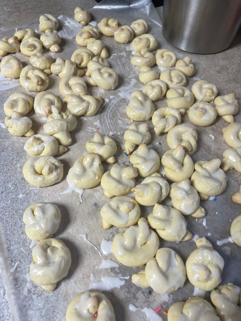 These are orange blossom biscotti from the King Arthur baking book. Not our favorite, though the icing is good. They are kind of eggy, in the way of Italian cookies, while I prefer cookies more short (full of butter).